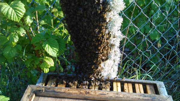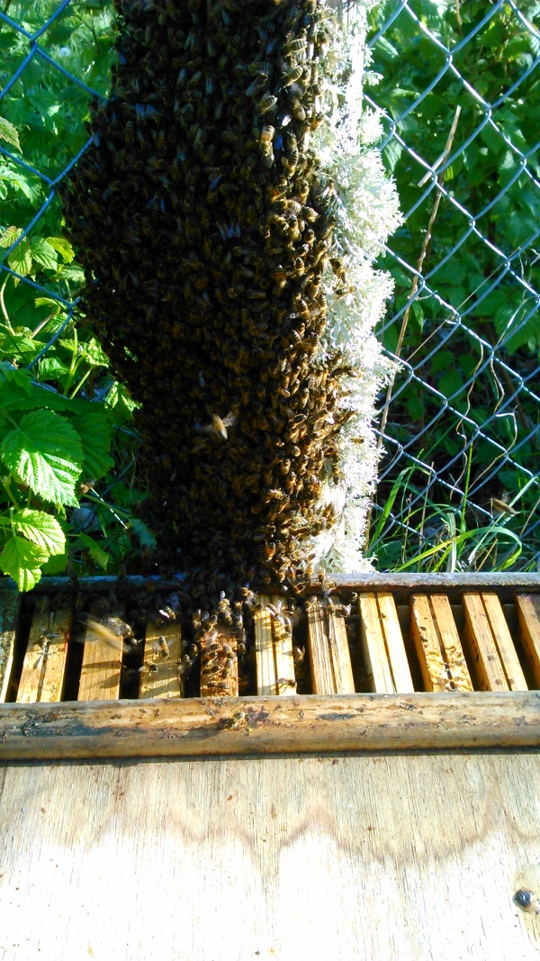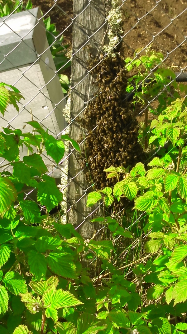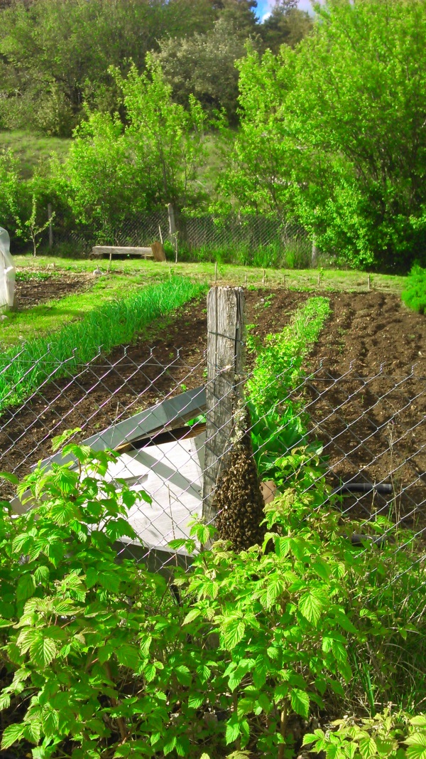 C’est la saison des essaims . Surprise cet après-midi là au potager ,elles se sont agglutinées sur un poteau de clôture.