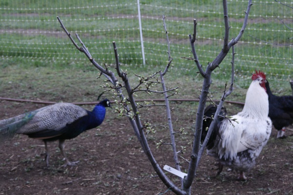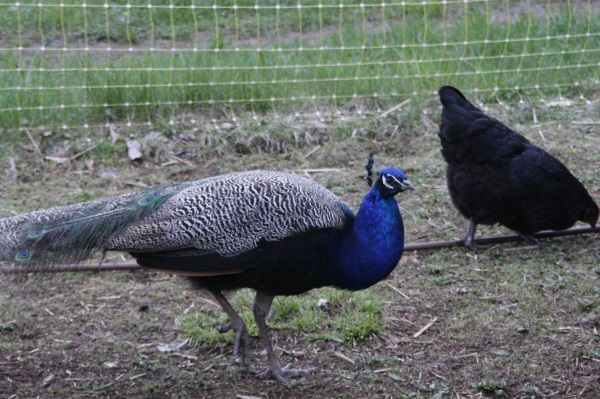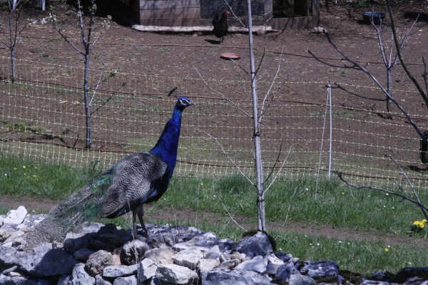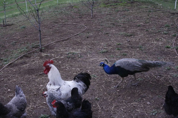 par Robert et Aimée ~ 1 mai 2013. Classé dans: Maison.Ce matin, notre voisin le paon est venu rendre visite à nos coq et poulettes.